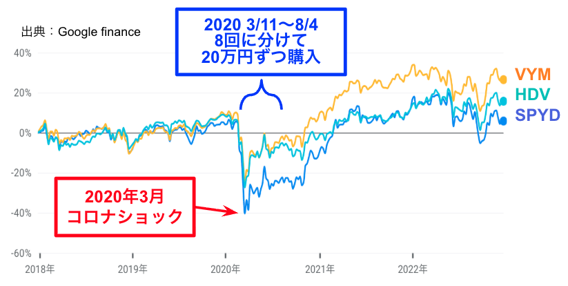 例えば、コロナショック後に私が米国高配当株ETFを買ったタイミングは以下です。