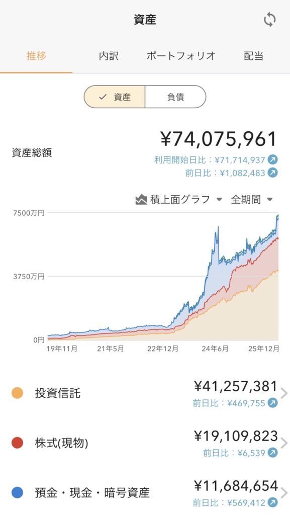 2025年12月現在の資産額は、7400万円くらいです。